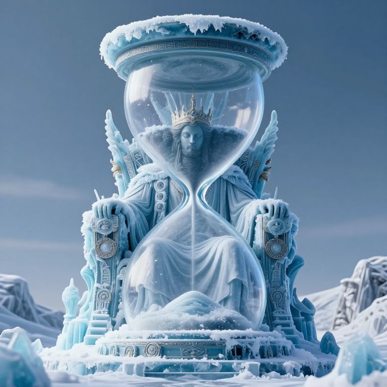 Photorealistic digital artwork of a frozen hourglass throne with a serene, crowned figure in flowing robes, surrounded by icy mountains.