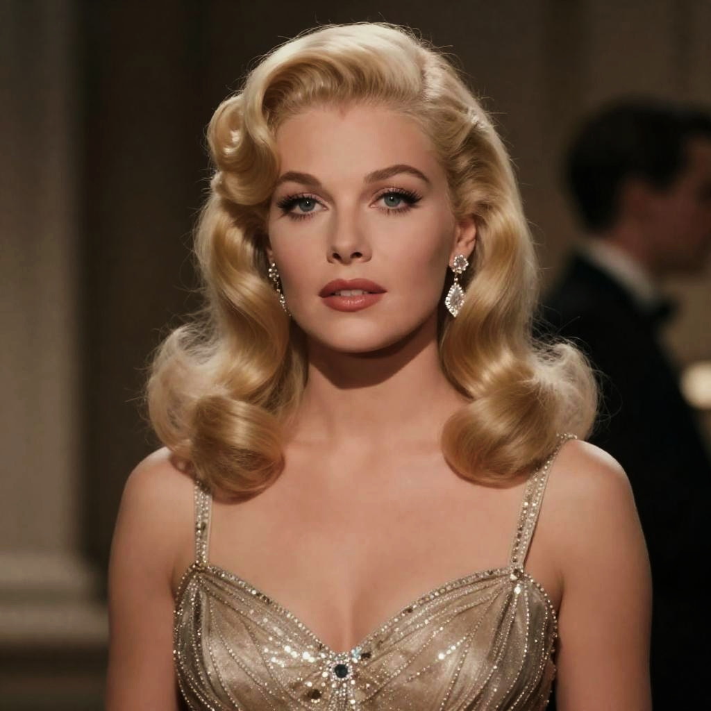 Realistic photo.An actor with long blonde hair styled in loose waves, wearing a glamorous evening gown and diamond earrings. Styled in the essence of Hollywood's Golden Age, with attention to vintage glamour. Designed as a film poster, capturing a blend of vintage elegance and bold, artistic style. realistic photo
