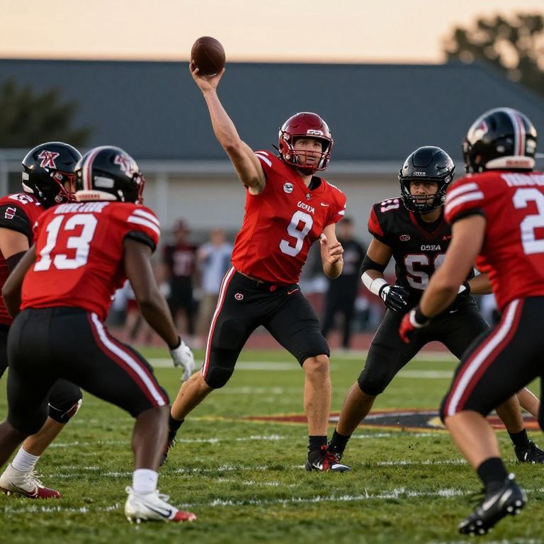 Uga.football game vivid scene at sunset with players mid-play, grass field with stadium in the background, red and black uniforms prominently displayed, focused quarterback throwing the ball, intense athletic moment, realistic textures and lighting, high energy sports event