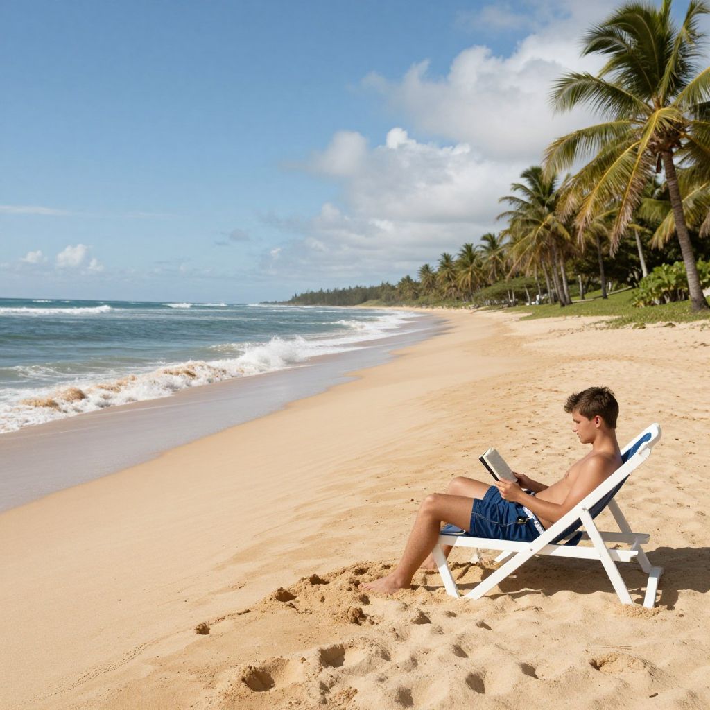 A peaceful daytime sandy beach scene in a tropical coastal region, featuring a long stretch of soft golden sand, gentle waves breaking near a quiet coastline, a young man with olive skin and short brown hair sitting on a beach lounge chair, holding a book, the background showing palm trees swaying in the breeze and a bright blue sky with scattered clouds.