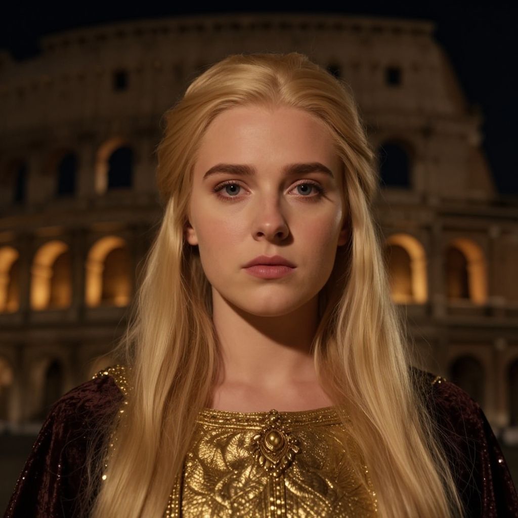 Best quality, detailed face, 1girl, solo, realistic, c1873h, long blonde_hair, king costume, amphitheater, night