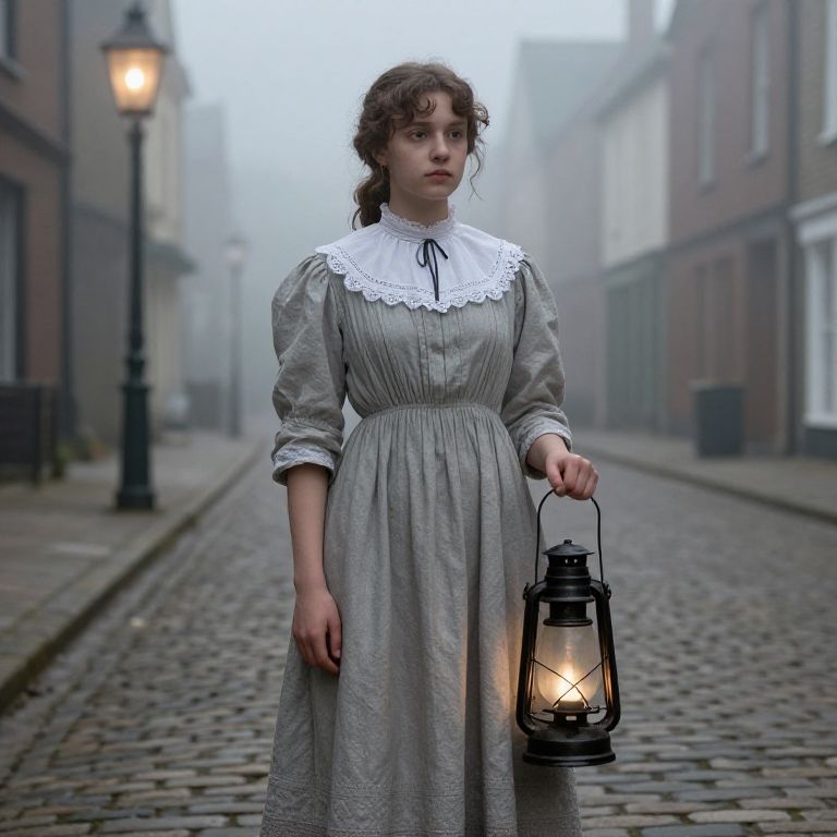 Portrait of a young person in a townsperson costume from the Victorian period, simple cotton dress with lace collar, holding a lantern, foggy cobblestone street with gas lamps, moody atmospheric lighting, highly detailed realism