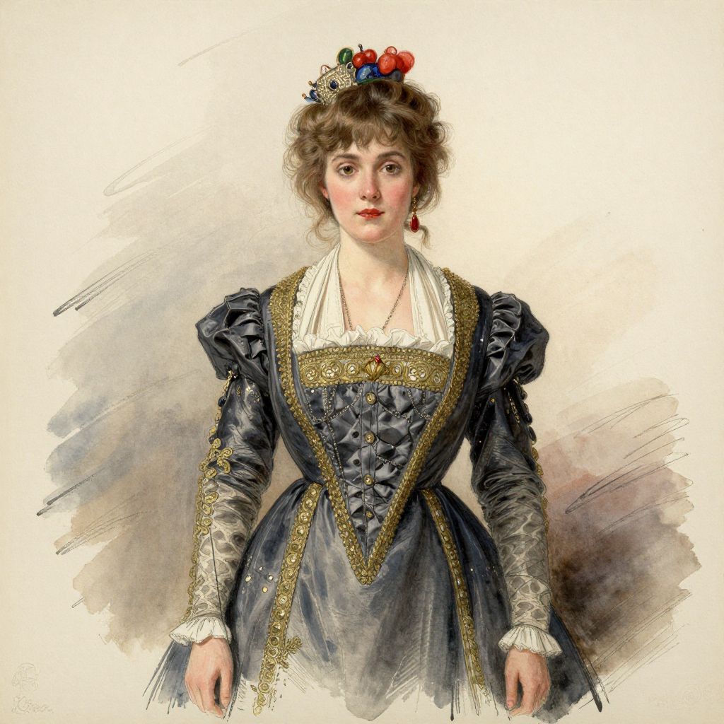 Watercolor drawing of a young woman in a blue, ornate gown with gold trim, red and blue jewels, and a gold crown, standing with