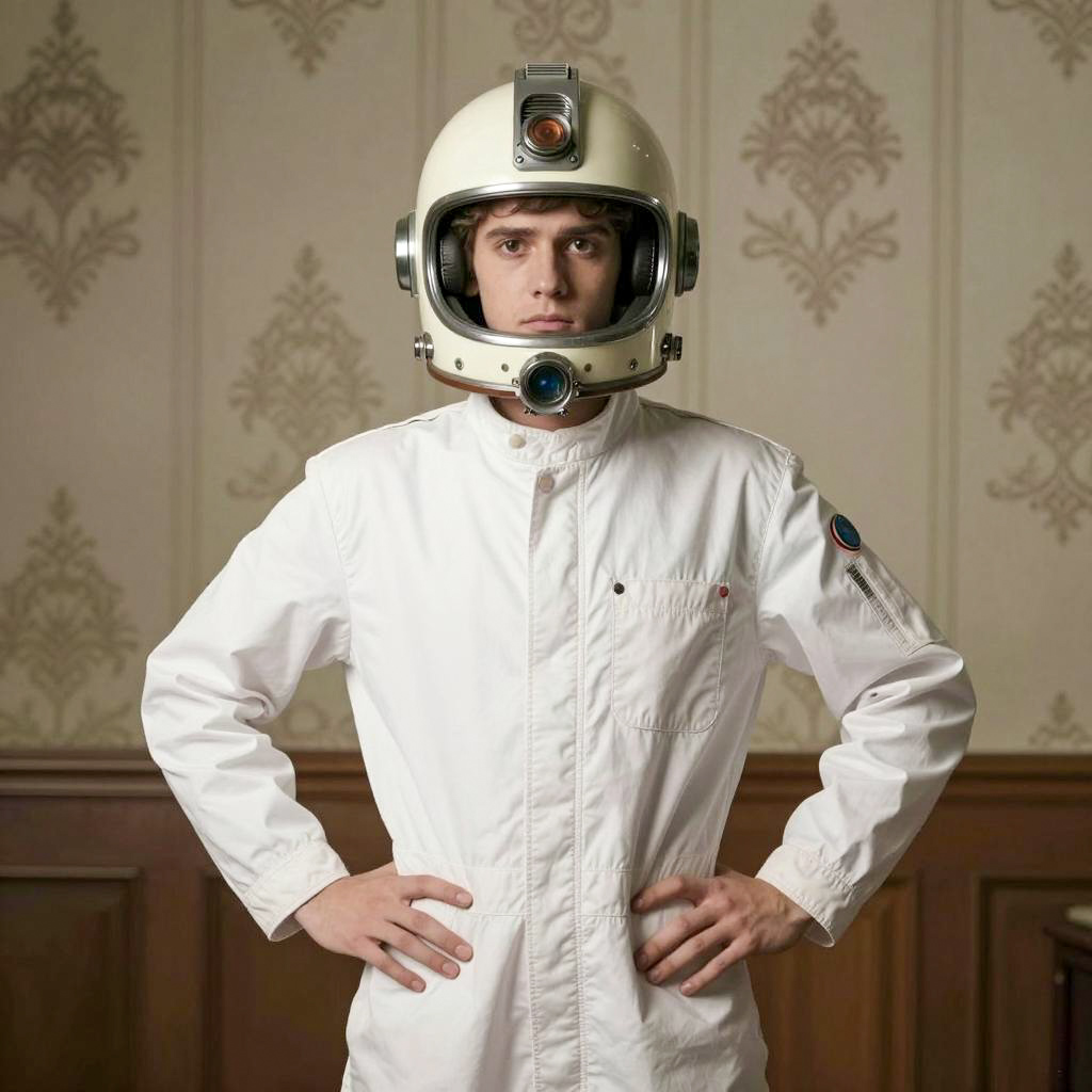 Weird science costume, photorealistic, young man, standing, vintage-style, sci-fi helmet, white jumpsuit, futuristic design, ornate wallpaper background, wooden paneling, serious expression, hands on hips, retro-futuristic, intricate helmet details, digital art, soft lighting, muted colors, detailed ures, mid-20th century sci-fi, realistic shadows, slightly melancholic mood