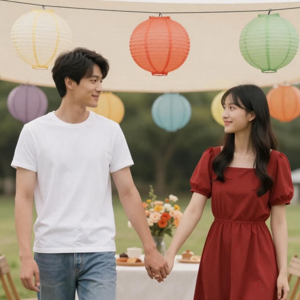 Photograph of a man and woman holding hands under a tent with colorful paper lanterns. The man, with short dark hair, wears a white t-shirt and blue jeans. The woman, with long black hair, wears a red dress with short sleeves. Background includes greenery and a table with a floral arrangement.