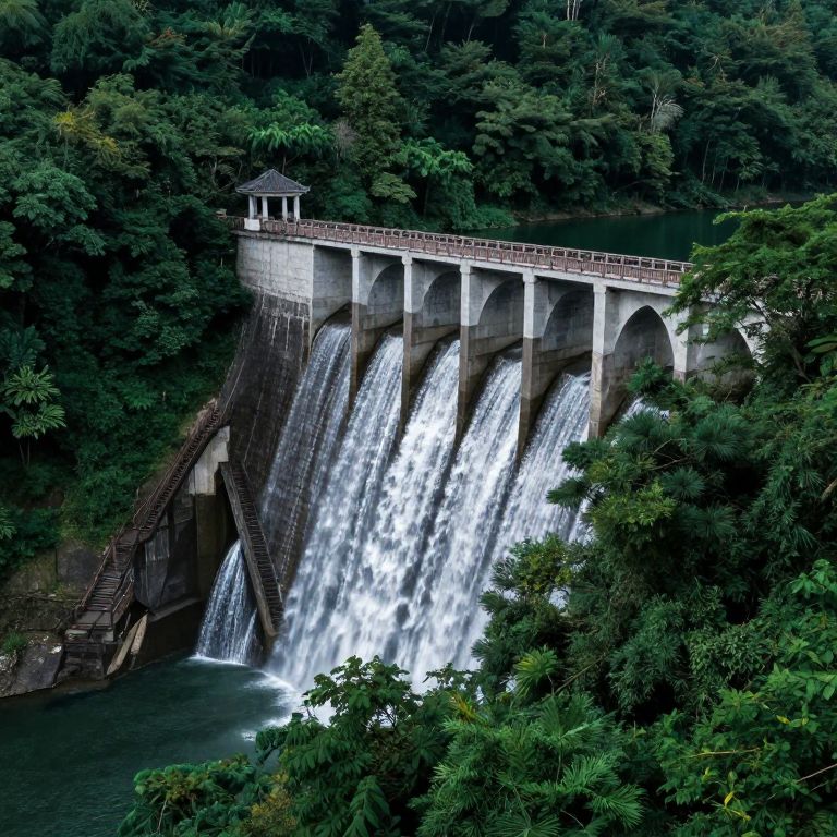 The image depicts a surreal, trippy landscape featuring a dam with water cascading over its structure, surrounded by a dense forest. The dam, with its geometric, abstract design, stands prominently in the center, supported by a series of arches and pillars. A wooden staircase leads up to a pavilion-like structure perched atop the dam, offering a vantage point over the flowing water. The forest, lush and dark green, flanks the dam on both sides, creating a stark contrast with the lighter, more industrial appearance of the dam itself. The overall composition is dynamic, with the water's movement adding a sense of fluidity to the otherwise rigid geometric forms. The interplay of colors, textures, and shapes creates a visually rich and complex scene, blending natural and man-made elements in a harmonious yet surreal manner.