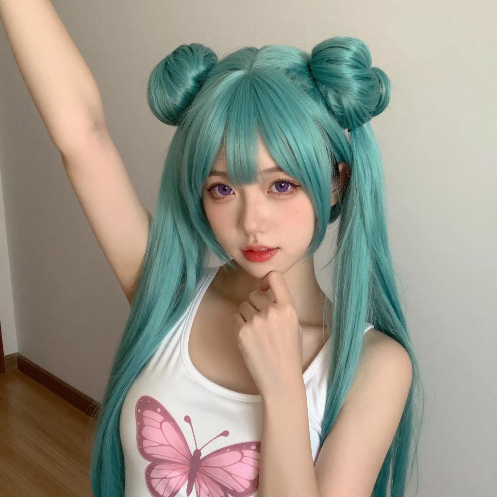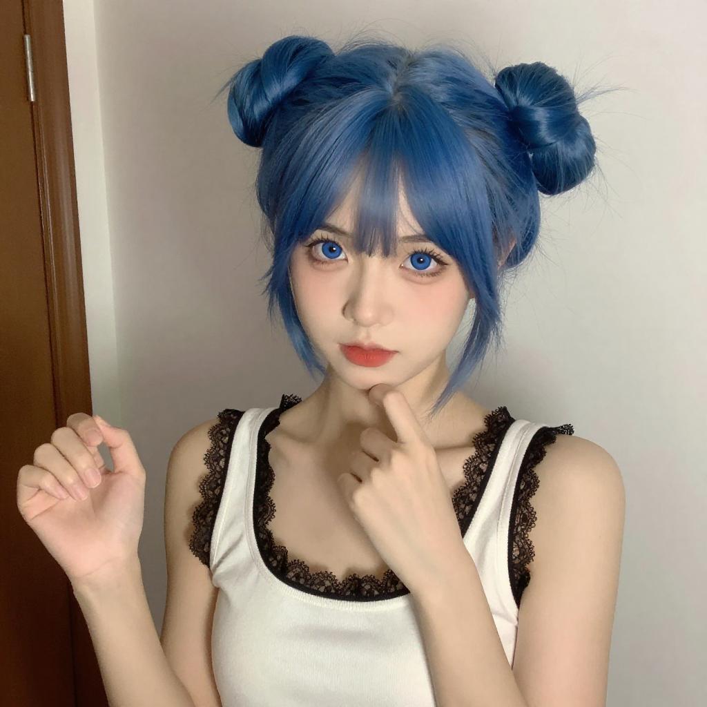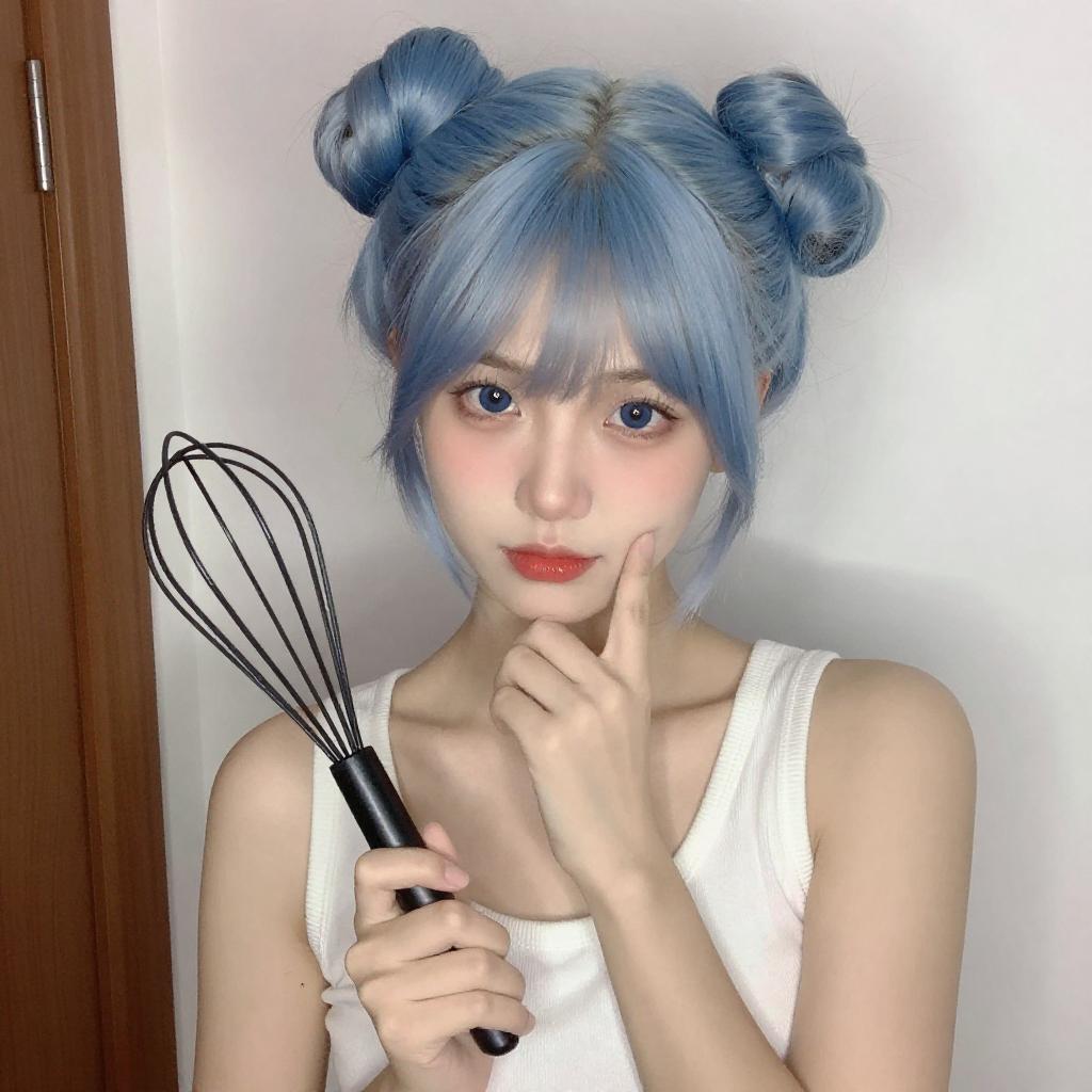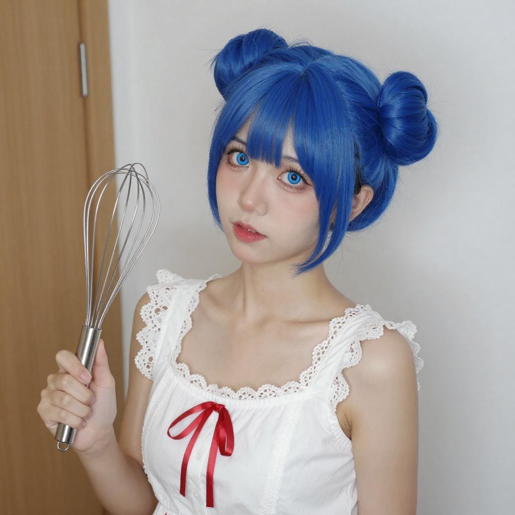 Photograph of a woman with bright blue twin buns and long hair, wearing a white tank top with a pink heart, holding a whisk. She has fair skin, red lipstick, and is looking up at the camera. She is kneeling on a wooden floor, with a plain white wall in the background.