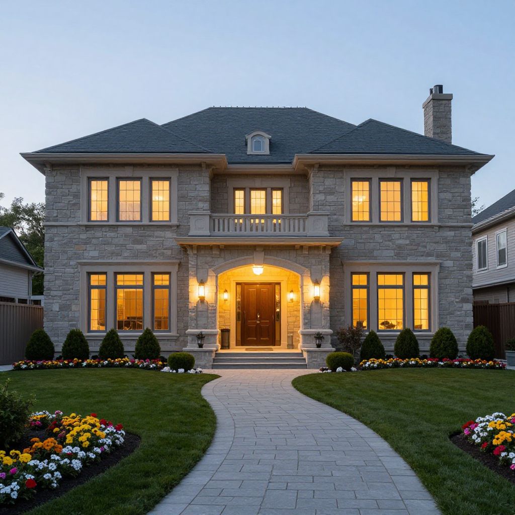 Grandly illuminated two-story mansion in Mississauga showcases elegant stone facade, arched entryway with warm lighting, symmetrical windows, and meticulously landscaped grounds featuring manicured shrubs, vibrant flowerbeds, and a sweeping stone pathway leading to the front door.
