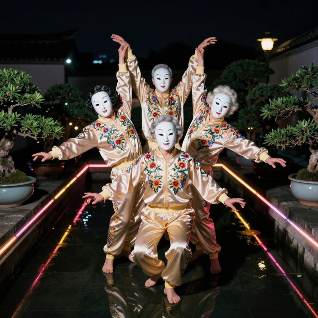 Four dancers performing in traditional folk costumes adorned with intricate beads in a scenic rural village decorated during harvest festival, photographed by Gillian Laub, shot on Fujifilm Velvia with a 35mm lens, high-detail golden hour lighting, f1.4 bokeh, hypermaximalist photorealistic portrait, elegant and appealing.