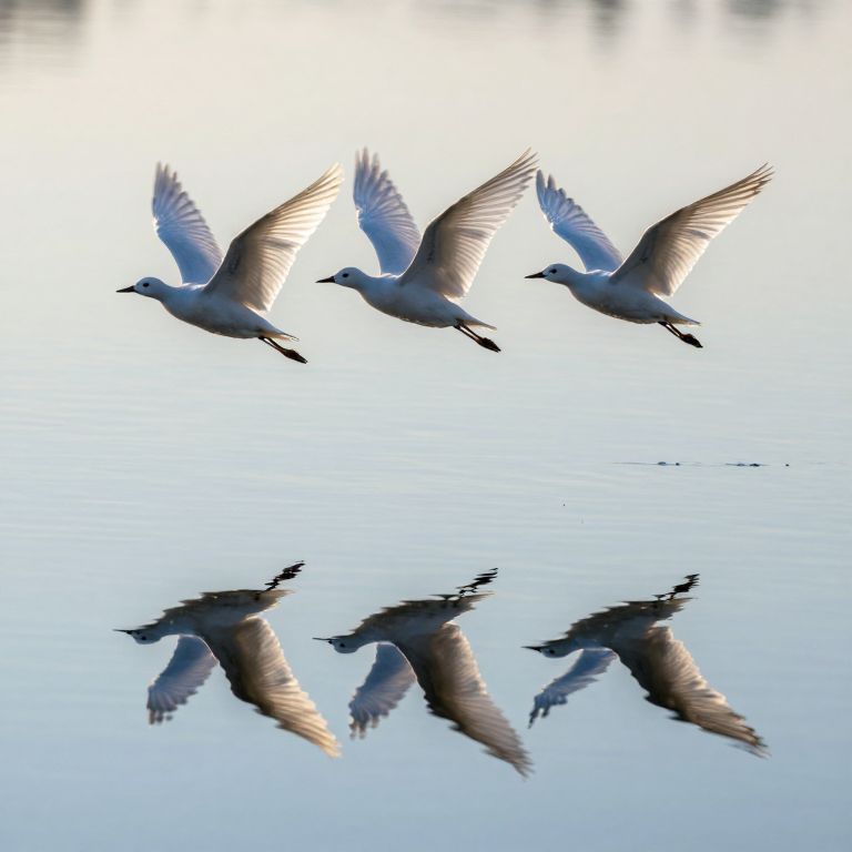 A spectral procession of birds with translucent, ethereal wings glides serenely above a mirror-like water surface, their silhouettes reflected perfectly as if suspended between two worlds.