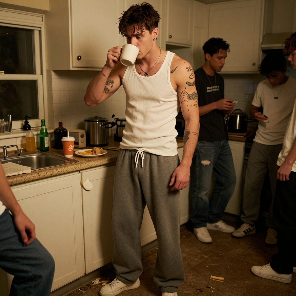 A muscular, tattooed young man in a messy kitchen, wearing baggy sweatpants and a tank top, drinks coffee while surrounded by friends, with warm lighting and a dramatic film effect.