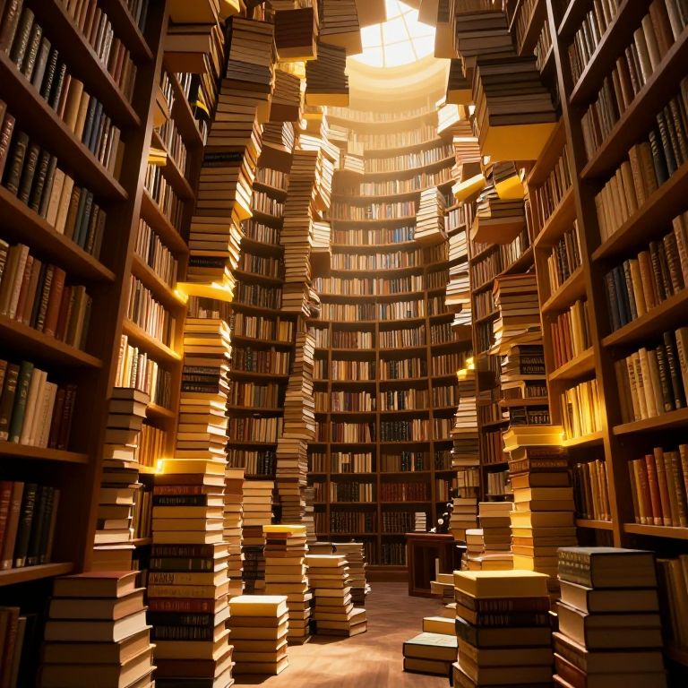 A mesmerizing library bathed in golden light, where books seem to pulse with life, their pages aglow and stacked in impossible, cascading formations that defy gravity, inviting the viewer into a realm where knowledge and wonder intertwine.