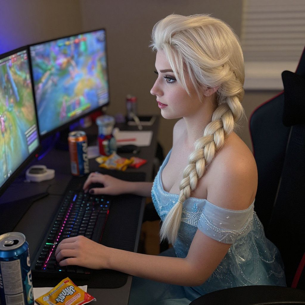 Photograph of a young woman with long, platinum blonde hair in a side braid, wearing an off-the-shoulder, sparkling blue dress resembling Elsa's from Frozen. She is sitting at a black desk with dual monitors displaying colorful video game screens. Her pale skin contrasts with her blue dress. The desk has a keyboard, a soda can, a can of energy drink, and a bag of chips. She is focused on the game, with her right hand on the keyboard. The background includes a window with white blinds and a gray wall. The lighting is soft, creating a cozy atmosphere.
