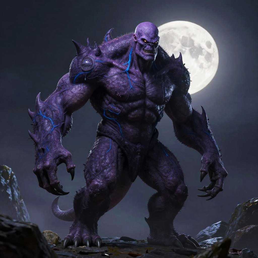 Bald monster standing on rocky terrain, purple skin texture, glowing blue veins, menacing stance, full moon in background, high detail, dark fantasy art