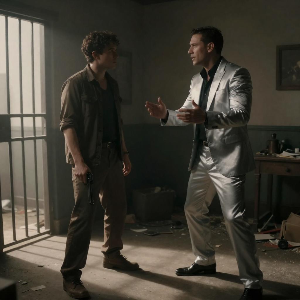 Two men facing each other in a dimly lit, cluttered room with debris scattered on the concrete floor. The man on the left, dressed in a brown shirt and pants, holds a handgun. The man on the right, wearing a shiny silver suit and black shoes, gestures with open hands. A metal gate and window cast contrasting patterns of light and shadow across the scene.