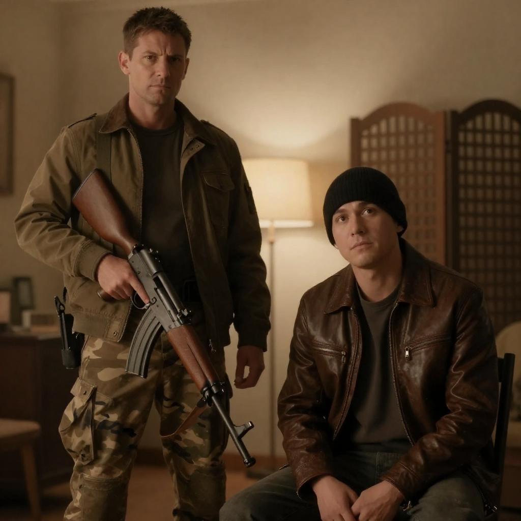 Photograph of two men in a dimly lit, cluttered room with debris on the floor. The man on the left wears a brown shirt and pants, holding a gun, while the man on the right, in a silver suit, gestures animatedly. A metal gate and bright light from a window create contrasting shadows.