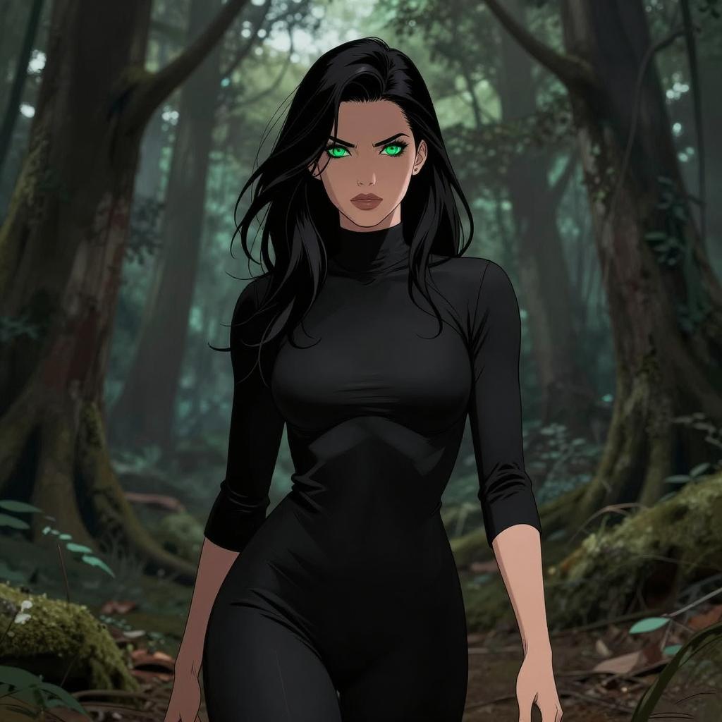 Digital comic book style artwork of a confident woman with long dark hair and striking green eyes, wearing a sleek black form-fitting outfit, standing in a dense, shadowy forest with tall trees and lush foliage, creating a mysterious and enigmatic atmosphere.