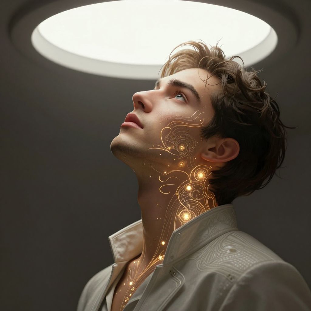 Portrait of a handsome young peruvian man looking at a bright light on the ceiling, head bent up, sci - fi, tech wear, glowing lights on face and neck, intricate, elegant, highly detailed, digital painting, artstation, concept art, smooth, sharp focus, illustration, art by artgerm and greg rutkowski and alphonse mucha