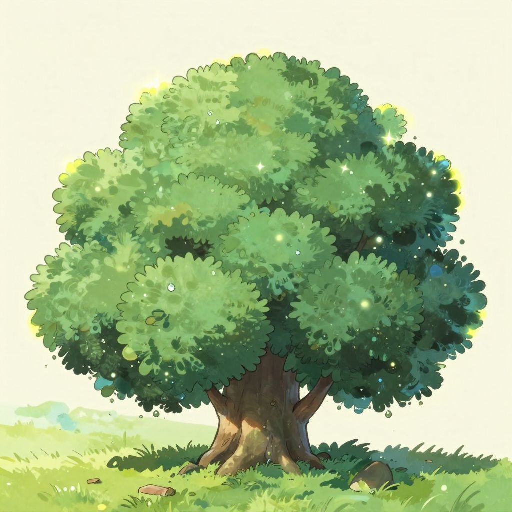 Digital illustration of a lush, green tree with dense foliage, sunlight filtering through, and small sparkles, standing on grassy ground.