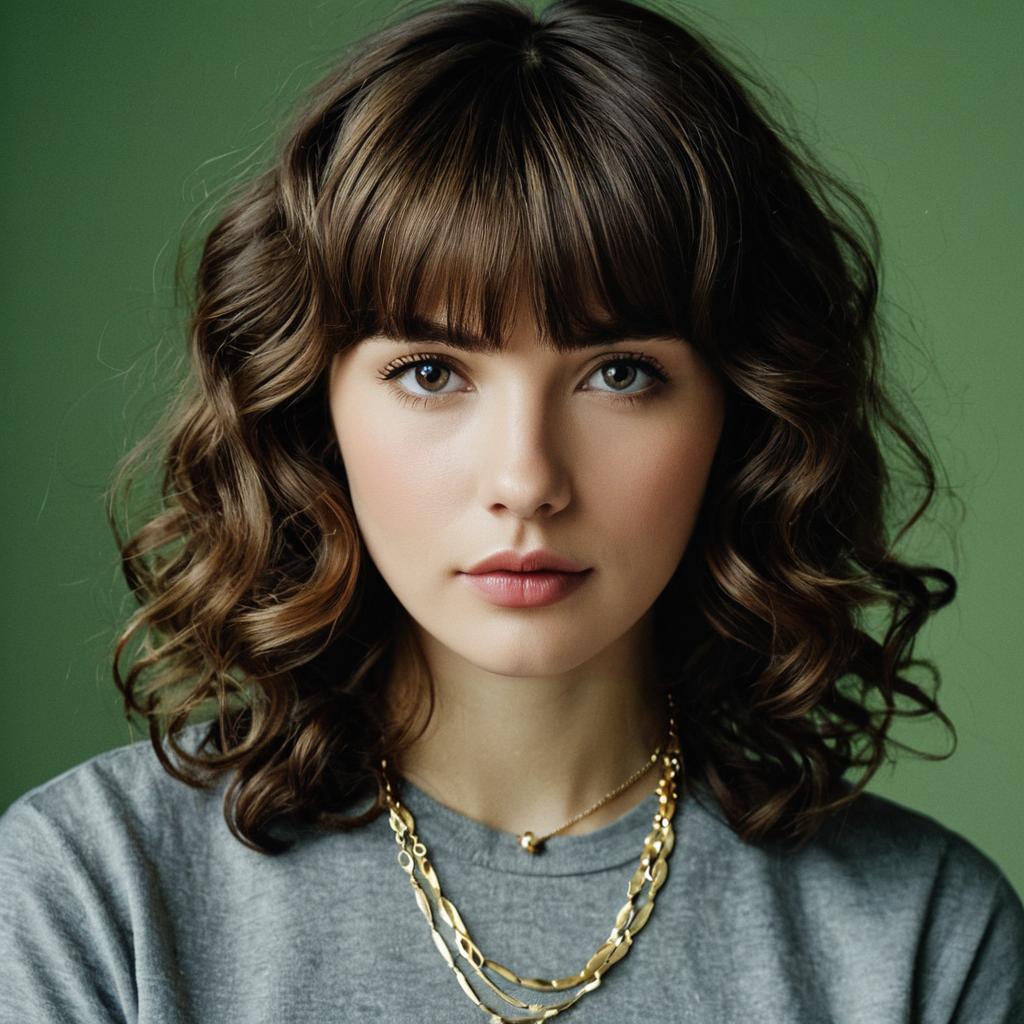 Close-up portrait of a young woman with short curtain bangs and wavy brown hair. She is wearing a grey shirt and layered gold necklaces. Her facial features include green eyes and natural makeup with closed lips. The background is solid green, highlighting her upper body and expressive gaze.