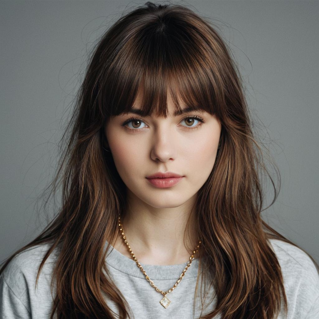 Style short curtain bangs ,1girl, solo, brown hair, jewelry, necklace, long hair, looking at viewer, realistic, wavy hair, grey shirt, shirt, lips, upper body, curly hair, closed mouth, green eyes