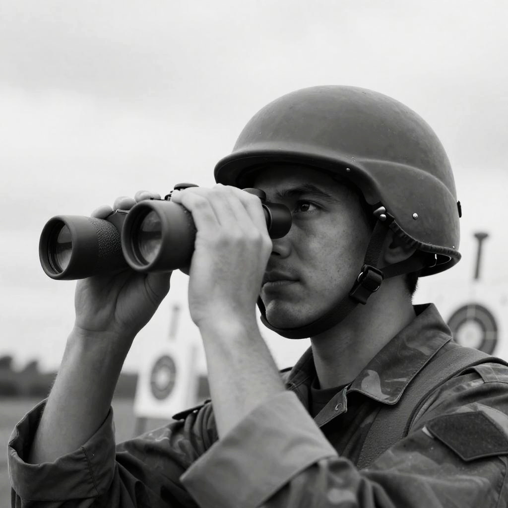 Middle-aged man with gray mustache, wearing a checkered flat cap, light brown uniform, and black tie, gripping binoculars, intense gaze, behind metal bars, blue and green lighting, dark background.