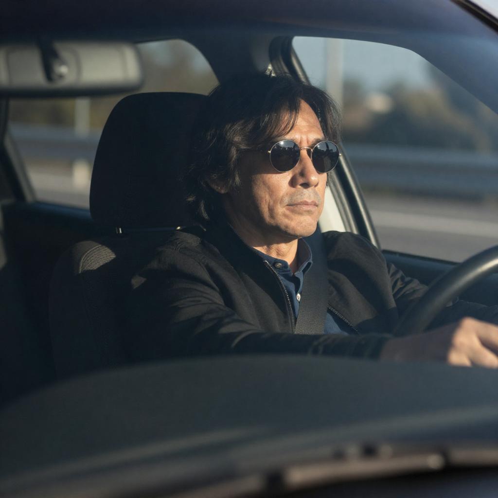 Photograph of a man with medium-length dark hair, wearing a dark shirt and jeans, walking down a narrow alley. He has sunglasses and a serious expression. Background includes brick walls, an archway, and a door with a picture. Sepia-toned.