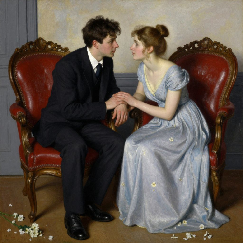 Romantic Realist painter Mark Arian's 1947 masterpiece depicts a tender moment between a man and woman seated on ornate red leather chairs, their hands gently clasped as they gaze at each other, surrounded by soft lighting and delicate white flowers scattered on the wooden floor.
