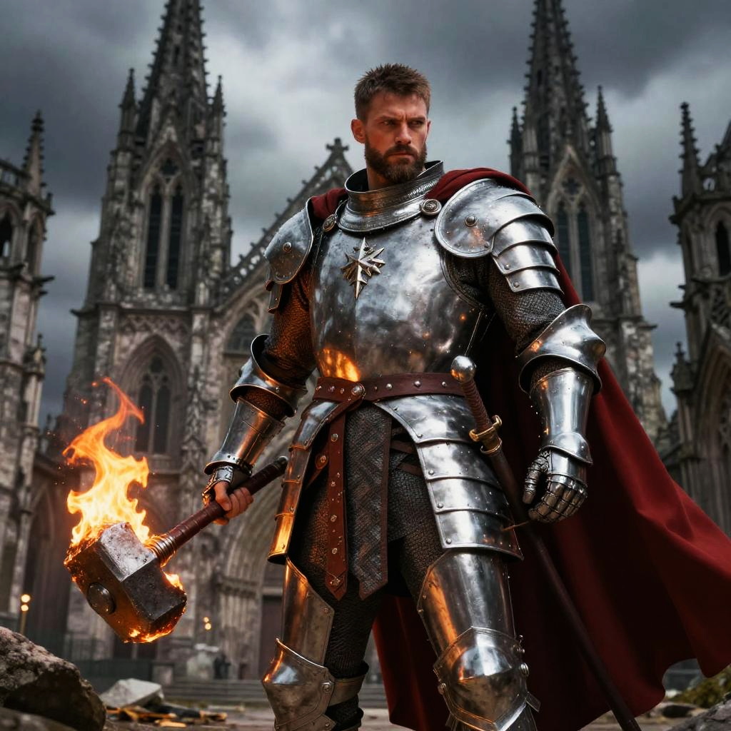 Photorealistic digital art: Muscular bearded knight in shiny silver armor with red cape, holding flaming war hammer, stands before gothic cathedral under