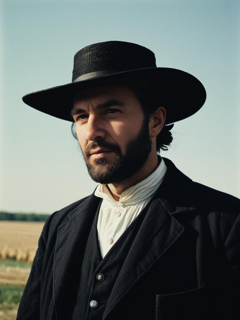 Man in Amish costume, cinematic realism, dramatic portrait