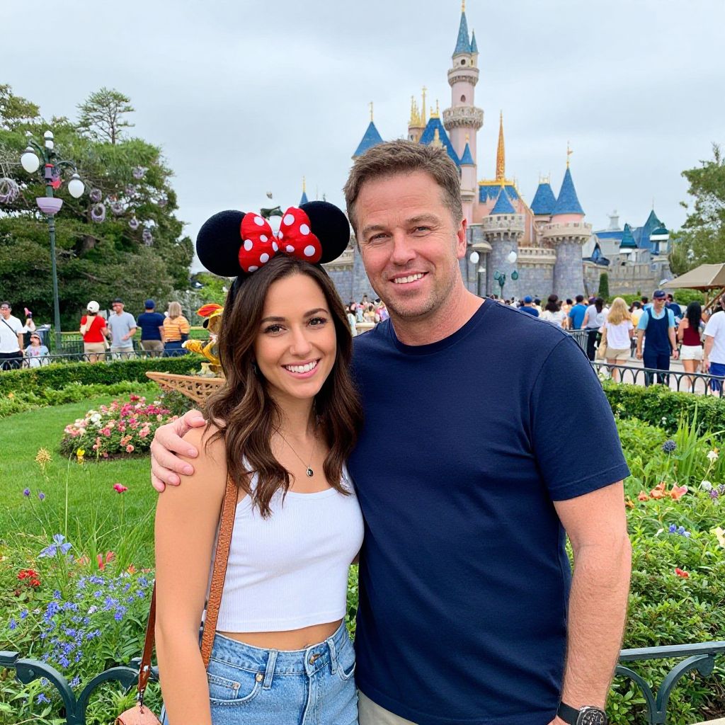Matt Damon stands smiling beside a woman in a vibrant Disneyland setting, with the iconic castle visible in the background amidst lush greenery and bustling crowds.