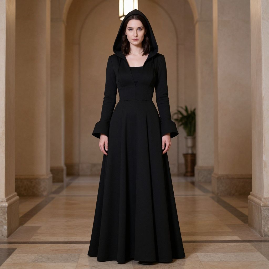 Nightsister Merrin Costume, woman in a black dress and hoodie standing in a hall