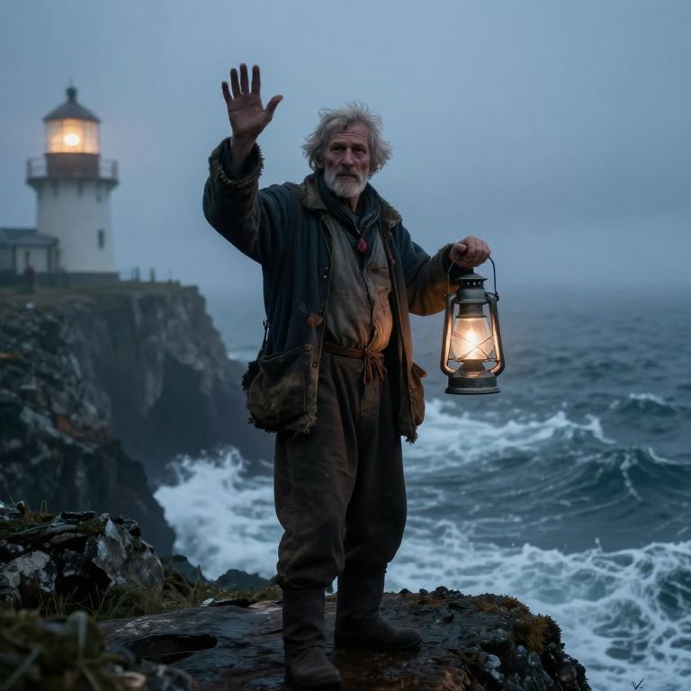 Cutty, a mysterious old lighthouse keeper standing on a cliff during a foggy evening, worn-out clothes, lantern in hand, waves crashing below, atmospheric and moody seascape, detailed textures, cinematic lighting.
