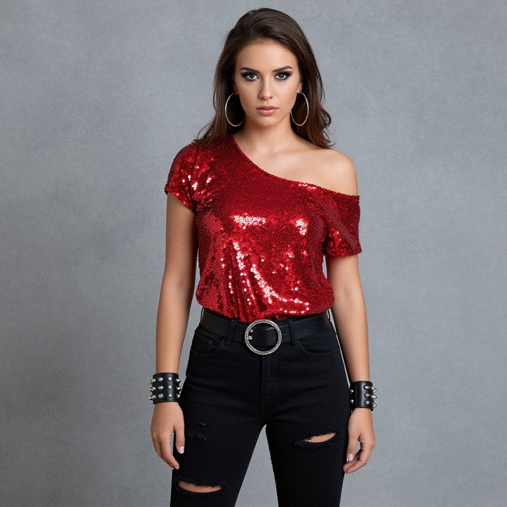 A stylish young woman poses confidently against a textured gray background, wearing a bold off-shoulder red sequin top paired with black ripped jeans. Her look is accentuated with large hoop earrings, studded leather wrist cuffs, and a black belt with a round buckle, blending glam and edgy fashion styles.