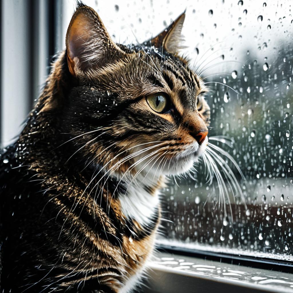 Cat perched in a windowsill on a rainy day, digital painting, macro lens, extreme close-up, diffused overcast light with water droplets, hyper detailed, highly realistic, intricate textures