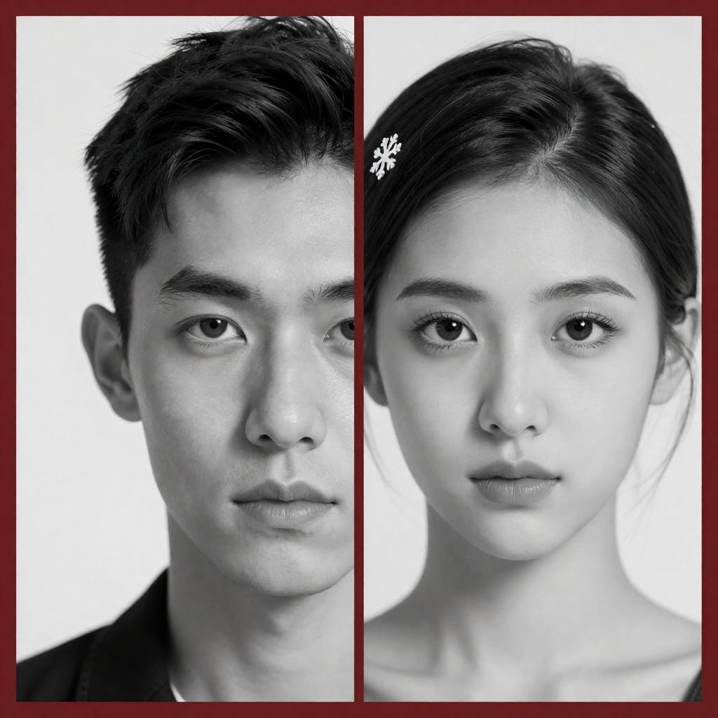 Split image of two black-and-white portraits. Left: male with short, neatly combed hair, focused eye. Right: female with glossy, side-parted hair, snowflake hairpin, focused eye. Red border separates portraits. Both have intense, direct gazes.