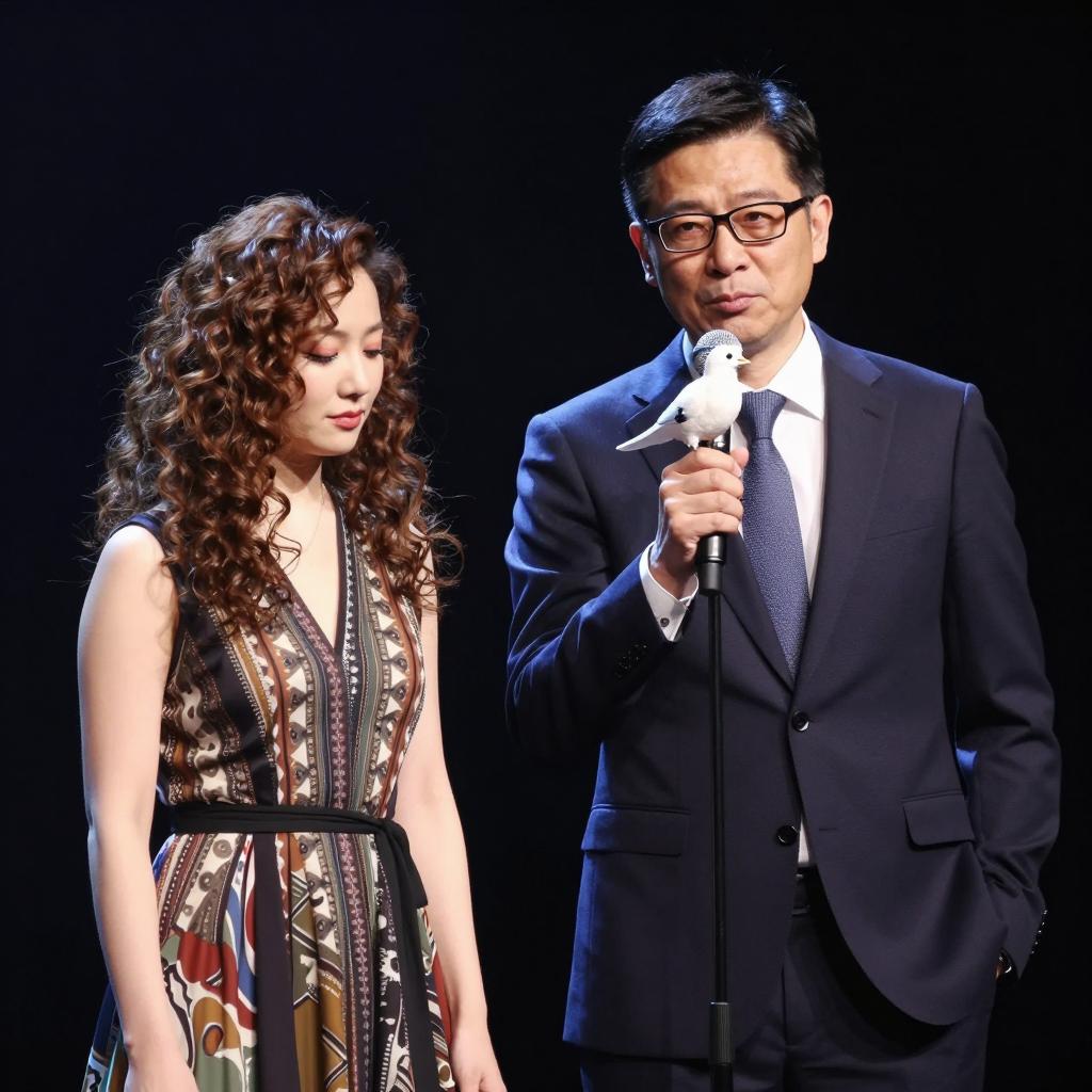 Man in dark suit and glasses holding a microphone with a white bird, standing next to a woman with curly brown hair in a sleeveless, patterned dress. Dark background, stage lighting, microphone stand. Man looks focused, woman looks down.