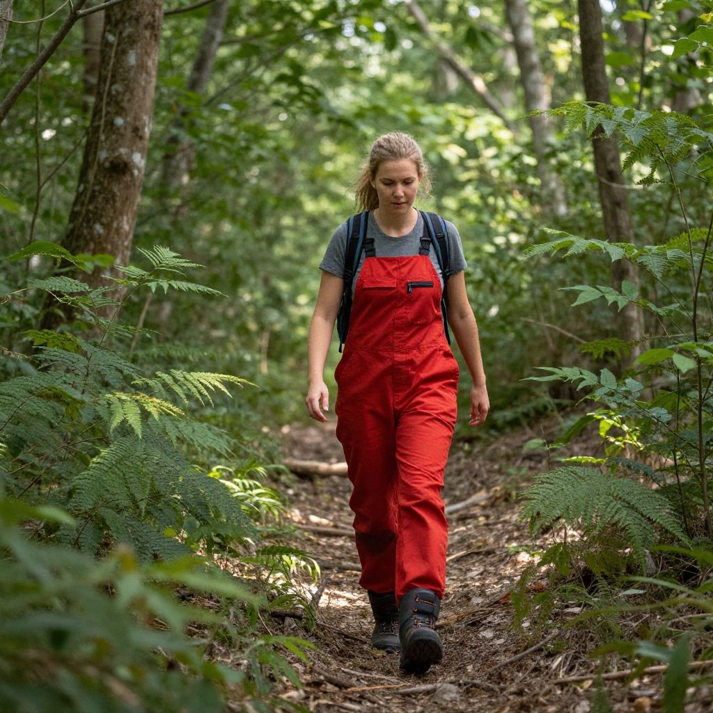 Red overalls women hiking through a lush green forest trail, sunlight filtering through the trees, adventurous and energetic, outdoor exploration theme, highly detailed nature background