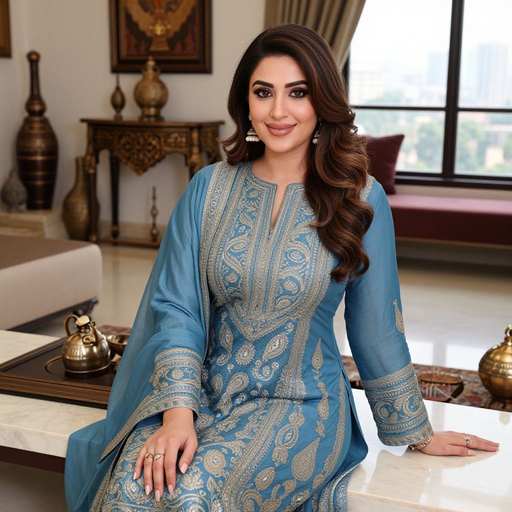 A stunning woman with deep brown eyes, a symmetrical face, and a warm smile wears a luxurious shalwar kameez in soft indigo with classic paisley patterns, sitting on a low marble sofa in a well-appointed family home in Karachi, surrounded by traditional artifacts and a large window showing a city view. The woman has big tits and cute face