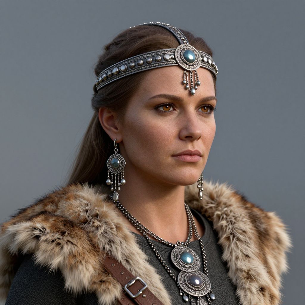 A digitally rendered depiction of a Latvian Viking woman adorned in intricate jewelry, featuring a detailed headpiece, dangling earrings, and a fur-lined garment, showcasing a blend of historical accuracy and high-definition realism.