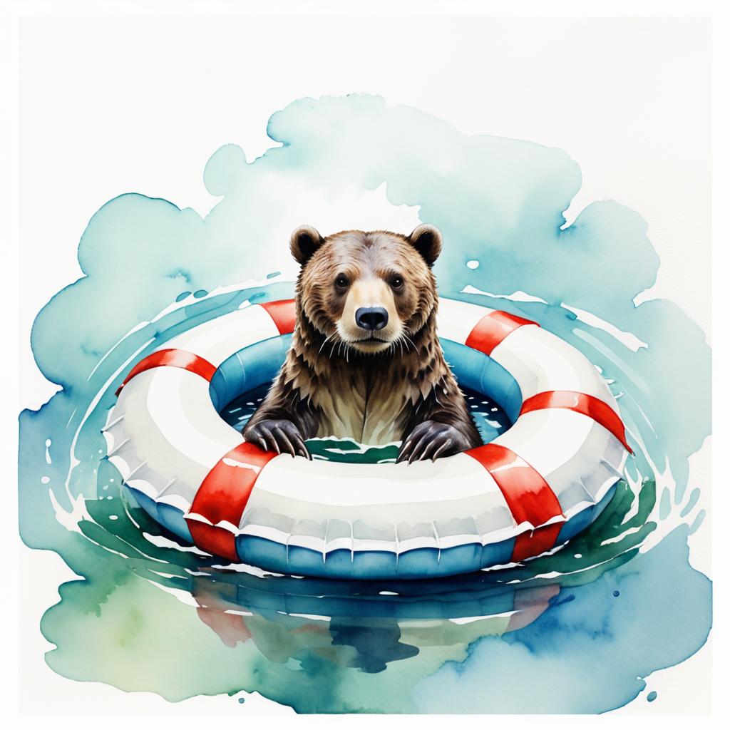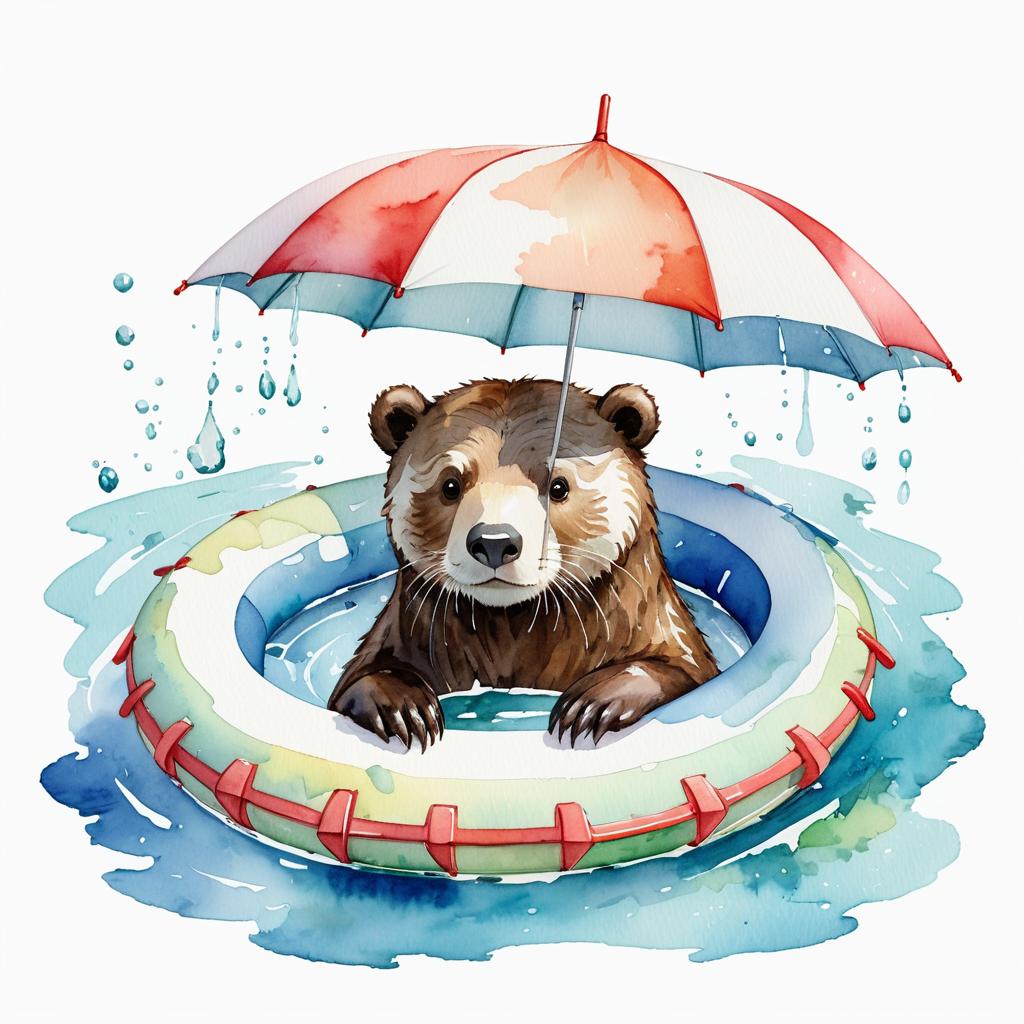 Watercolor painting of a brown bear partially submerged in water, sitting inside a colorful swim ring. The bear is sheltered by a red, white, and blue umbrella with water droplets falling around. The image has a clean white background and soft watercolor textures.