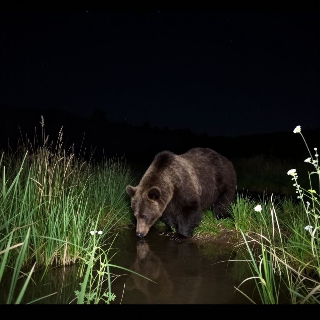 Trailcam footage capturing a nighttime scene of a bear foraging near a riverbank, water reflections visible, starry sky above, with a mix of tall grasses and wildflowers framing the shot.