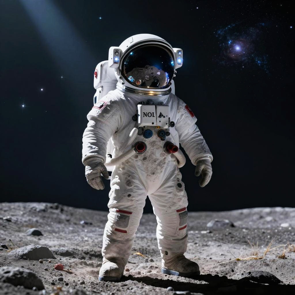 Photograph of a NASA astronaut in a white space suit standing on a rocky lunar surface, illuminated by a beam of light against a dark, star-filled