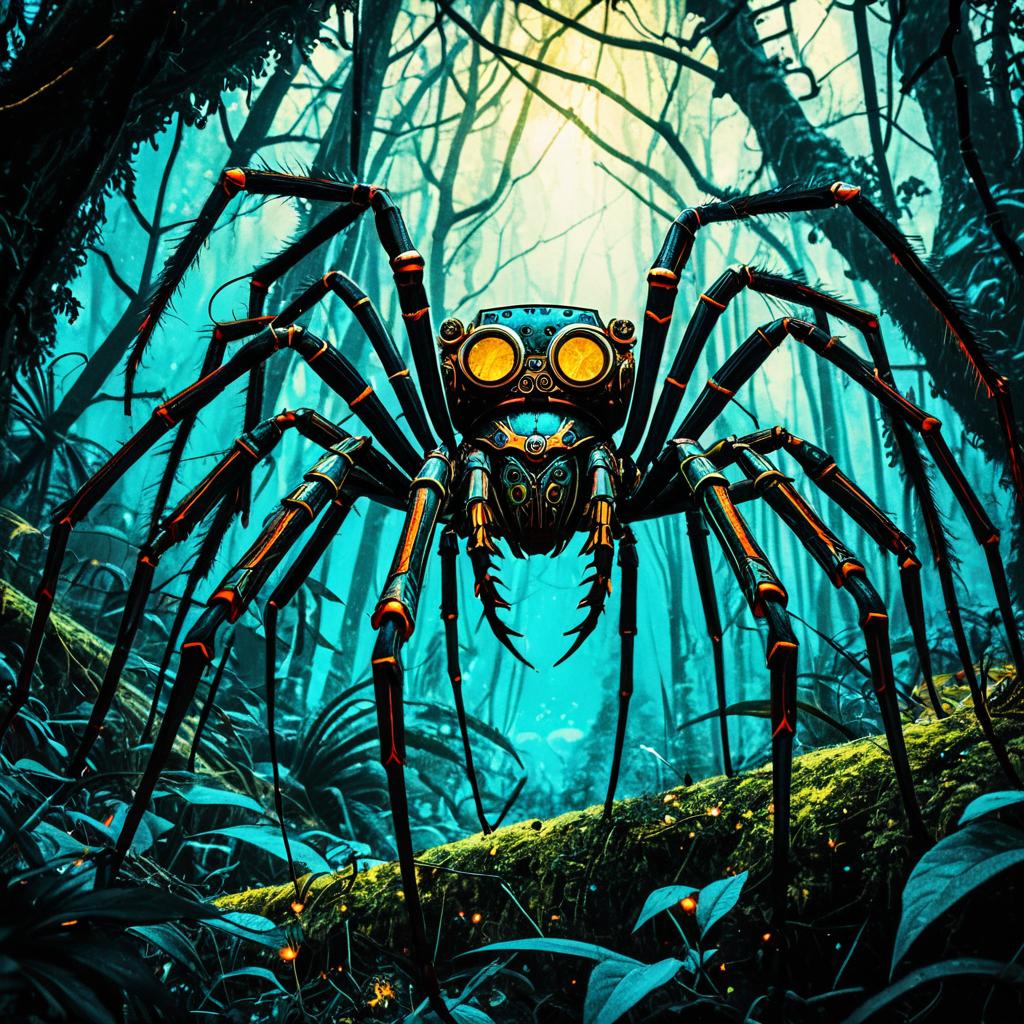Detailed digital illustration of a colorful steampunk-style spider with mechanical features and glowing elements, set in a mystical fantasy forest canopy. The vibrant image has high contrast and intricate detailing, showcasing a surreal atmosphere with glowing highlights and elaborate design on the spider, surrounded by dense forest foliage and soft glowing lights.