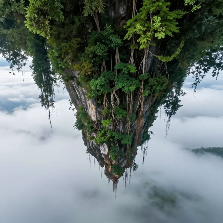 A verdant forest clings defiantly to the underside of a suspended cliff, its trees growing upside-down with roots cascading into the ethereal clouds below, defying gravity in a serene, otherworldly tableau.
