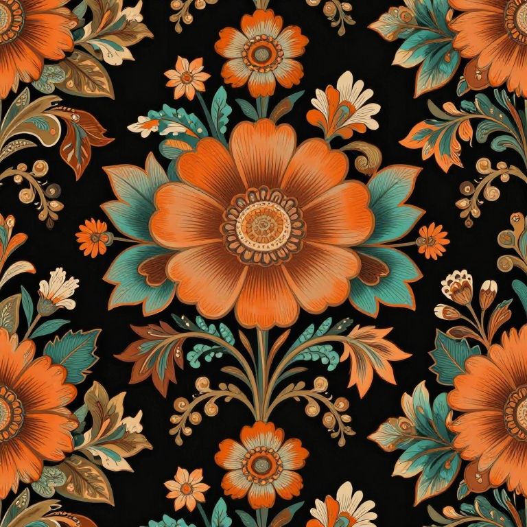 The image showcases a vibrant 70s style wallpaper design featuring an intricate and ornate floral pattern. The composition is rich with a variety of flowers, each meticulously detailed and colored in shades of orange, teal, and brown. The flowers are arranged in a symmetrical, yet dynamic manner, creating a sense of movement and depth. The central flower, with its large, circular petals and detailed center, serves as the focal point, surrounded by smaller flowers and ornamental swirls that extend outward. The background is a deep, contrasting black, which accentuates the colorful flowers and makes them stand out prominently. The overall effect is sophisticated and organic, with the interplay of colors and textures adding to the visual complexity and appeal of the design.