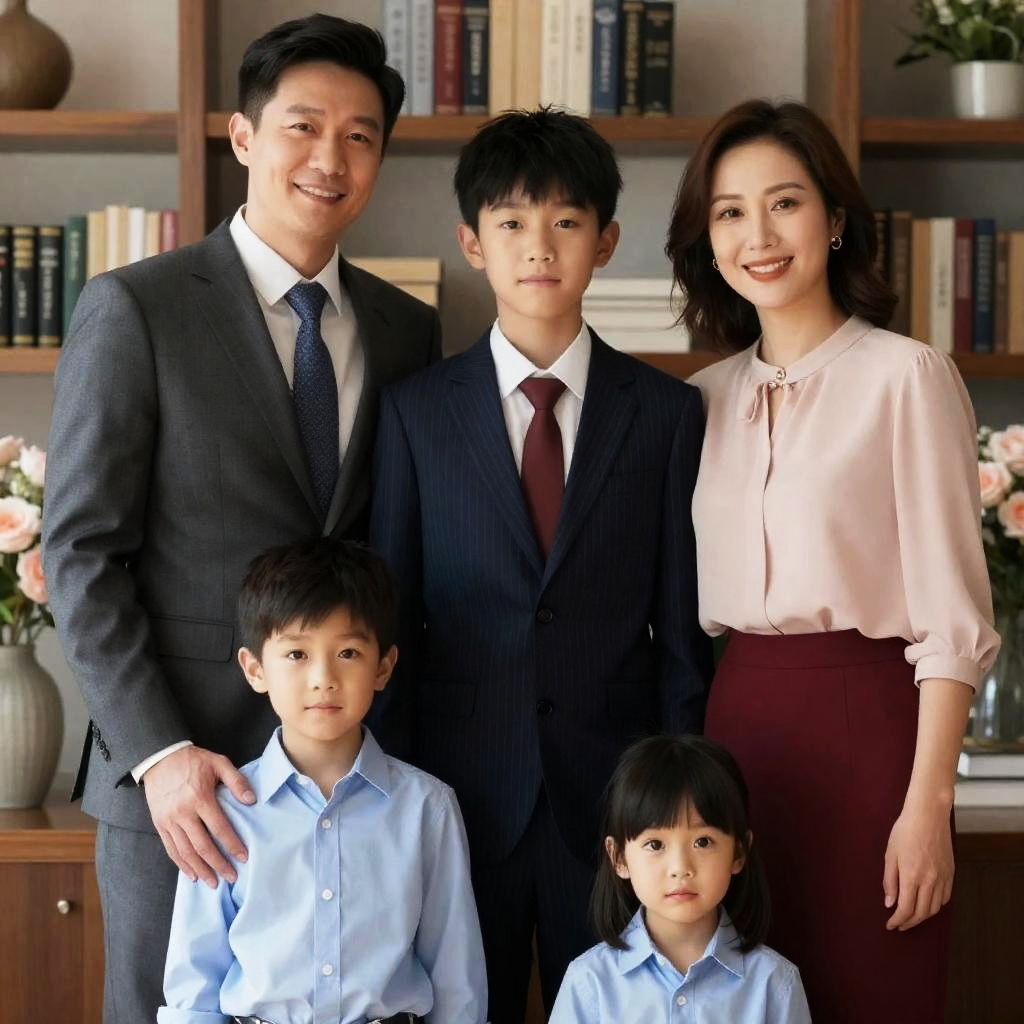 Photograph of a family of five standing together indoors. Man in pinstripe suit and tie, woman in pink blouse and red skirt, teenage boy in striped suit, younger boy in blue shirt, youngest child in blue shirt. Bookshelves and floral decorations in background. Man on left smiling, woman on right smiling, teenage boy with relaxed expression, younger boy with neutral expression, youngest child with curious expression. Family standing close together, man with hand on teenage boy's shoulder.