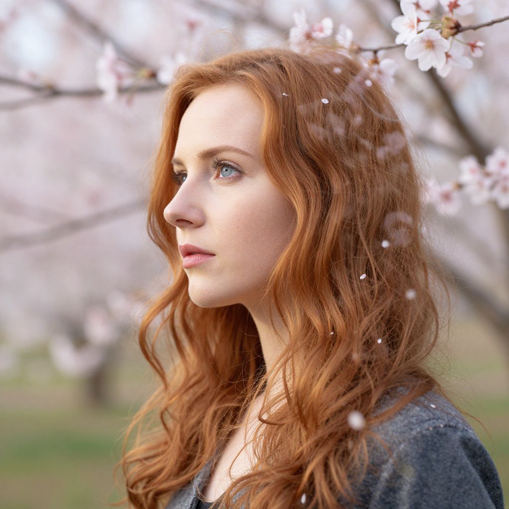 Photograph of a young woman with fair skin and long, wavy auburn hair, facing left. She has blue eyes, a slender nose, and light pink lips. She wears a dark gray top. The background is blurred but features white cherry blossoms on branches, with some petals floating in the air. The lighting is soft, highlighting her hair and face. The overall mood is serene and spring-like. The focus is on the woman's profile, with a shallow depth of field that keeps the blossoms slightly out of focus.