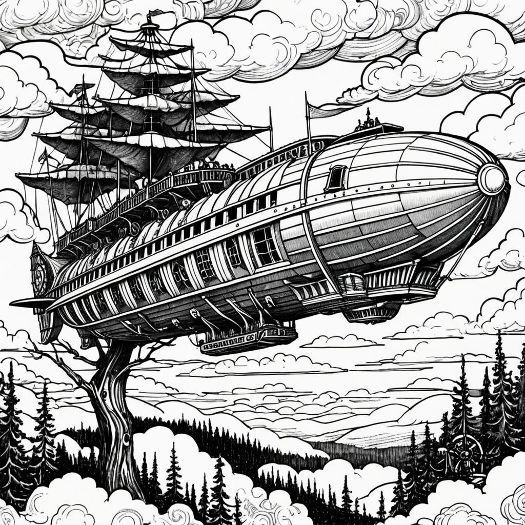 Intricate Steampunk Airship on Sequoia Tree Coloring Page