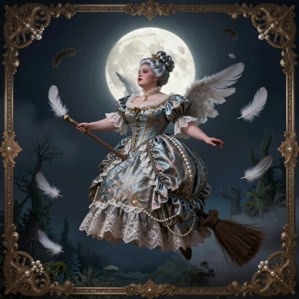 A whimsical, gothic fairytale illustration of a plump and magical woman with silver-streaked Gibson girl updo, flying through a surreal night sky on a broom, surrounded by feathers and pearls, in front of a glowing full moon. She wears a voluminous high-collared brocade gown with bustle and lace overlays with delicate lace and ornate details, framed by an elaborate vintage border. The scene is rendered in a highly decorative style with muted jewel tones and a mystical forest below.